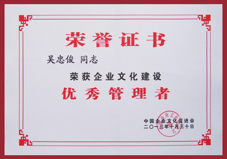 集團公司被授予“企業(yè)文化建設百佳單位”榮譽稱號;集團公司總經(jīng)理、黨委書記吳忠俊被第四屆七次理事會選為中國企業(yè)文化促進會副會長,并被評為“企業(yè)文化建設優(yōu)秀管理者”;集團公司企業(yè)文化策劃處處長俆世革被評為“企業(yè)文化建設先進工作者”。我司在企業(yè)文化建設方面的成績得到了充分肯定。