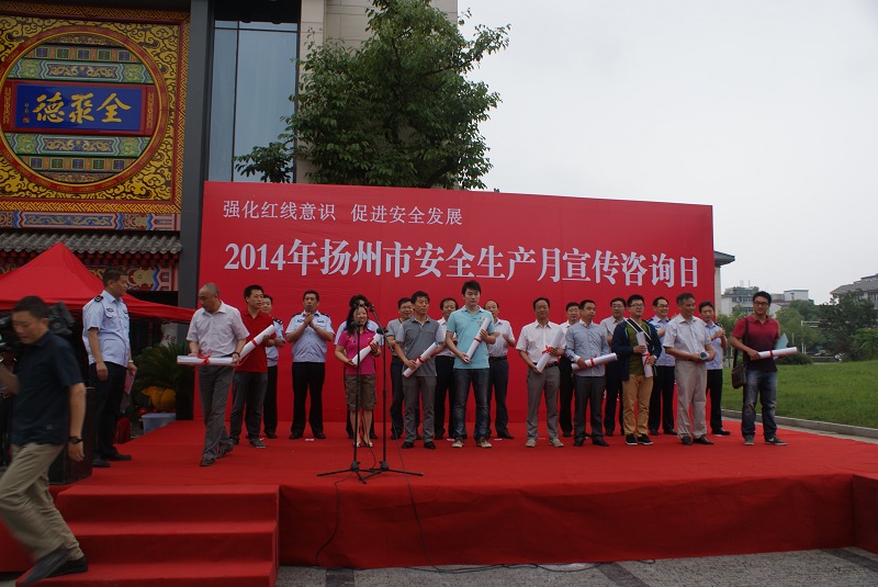 6月16日上午,揚州市安委辦會同蜀崗—瘦西湖風(fēng)景名勝區(qū)管委會在虹橋坊舉行了以“強化紅線意識,促進安全發(fā)展”為主題的2014年揚州市“安全生產(chǎn)月”宣傳咨詢?nèi)栈顒印J邪参瘯、市安監(jiān)局、蜀岡—瘦西湖風(fēng)景名勝區(qū)管委會、市人保公司負責(zé)人出席了活動。市安監(jiān)局、揚汽集團、市城建控股集團、市工藝美術(shù)集團、金茂化工集團、揚子江集團、建工控股集團等11家單位以及消防、建筑、燃氣、氣象、質(zhì)監(jiān)、部分駐揚單位的職工代表共計400余人參加了活動。