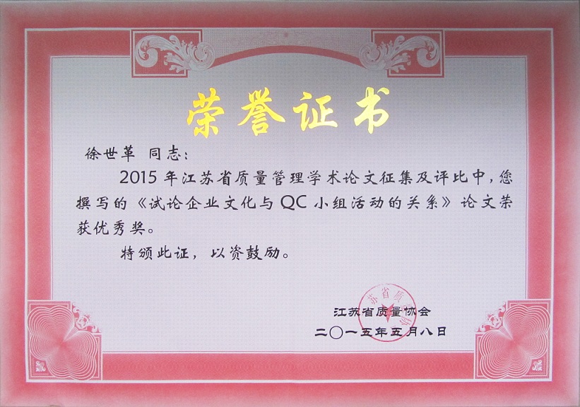 由江蘇省質(zhì)量協(xié)會舉辦的2014年江蘇質(zhì)量管理學(xué)術(shù)論文征集評選活動落下帷幕,5月8日在南京華江賓館召開了江蘇質(zhì)量管理學(xué)術(shù)論文表彰暨交流會,江蘇省質(zhì)量技術(shù)監(jiān)督局副局長張前、質(zhì)量處處長兼省質(zhì)量協(xié)會副秘書長祁寧清、省質(zhì)量協(xié)會會長耿寧等及獲獎作者參加了會議。集團(tuán)公司徐世革同志的《試論企業(yè)文化與QC小組活動的關(guān)系》榮獲優(yōu)秀獎。
