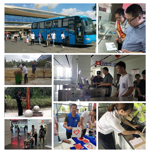 車站各班組分工協(xié)作打掃各自責(zé)任區(qū)域,清掃工作臺、參加"志愿服務(wù) 美好你我他"第三屆江蘇志愿服務(wù)展示交流活動、清掃路邊綠化帶、噴灑藥水、除雜草滅蟲害、整理通道入口、設(shè)備設(shè)施維護、消防安全檢查、身份實名驗證、檢查危險禁運物品、檢查客車安全帶、為特殊旅客提供一站式服務(wù)、熱情引導(dǎo)購票、候車,征詢旅客意見、開展問卷調(diào)查,以整潔的站區(qū)環(huán)境、良好的精神風(fēng)貌和優(yōu)質(zhì)的候乘服務(wù)當(dāng)好東道主,文明迎盛會。