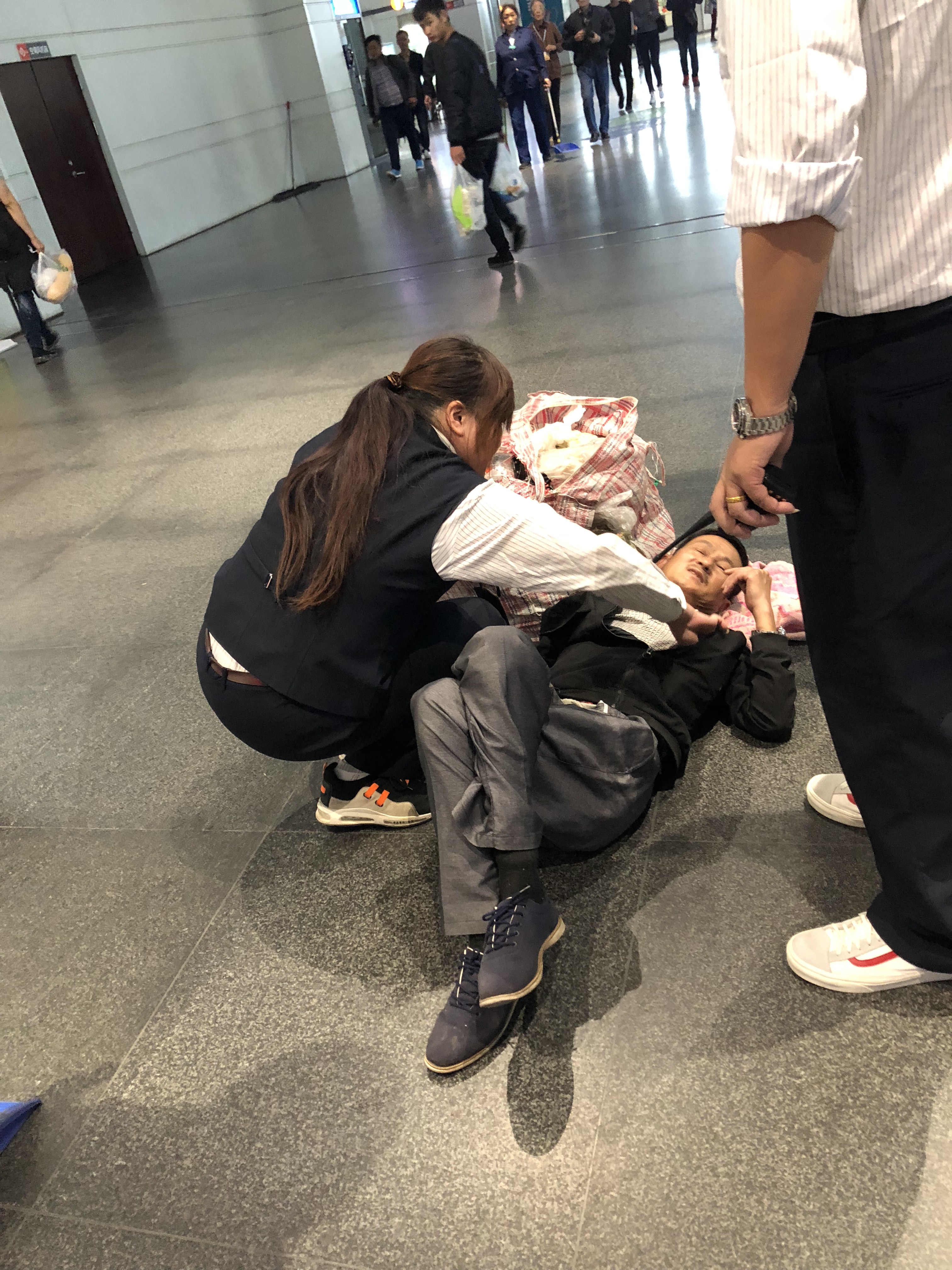 11月3日,來(lái)自徐州的張先生注射了胰島素之后沒(méi)有及時(shí)就餐,導(dǎo)致低血糖發(fā)生,在揚(yáng)州站的售票廳突然摔倒在地,神情迷糊,難以起身,大小包裹掉落一地。