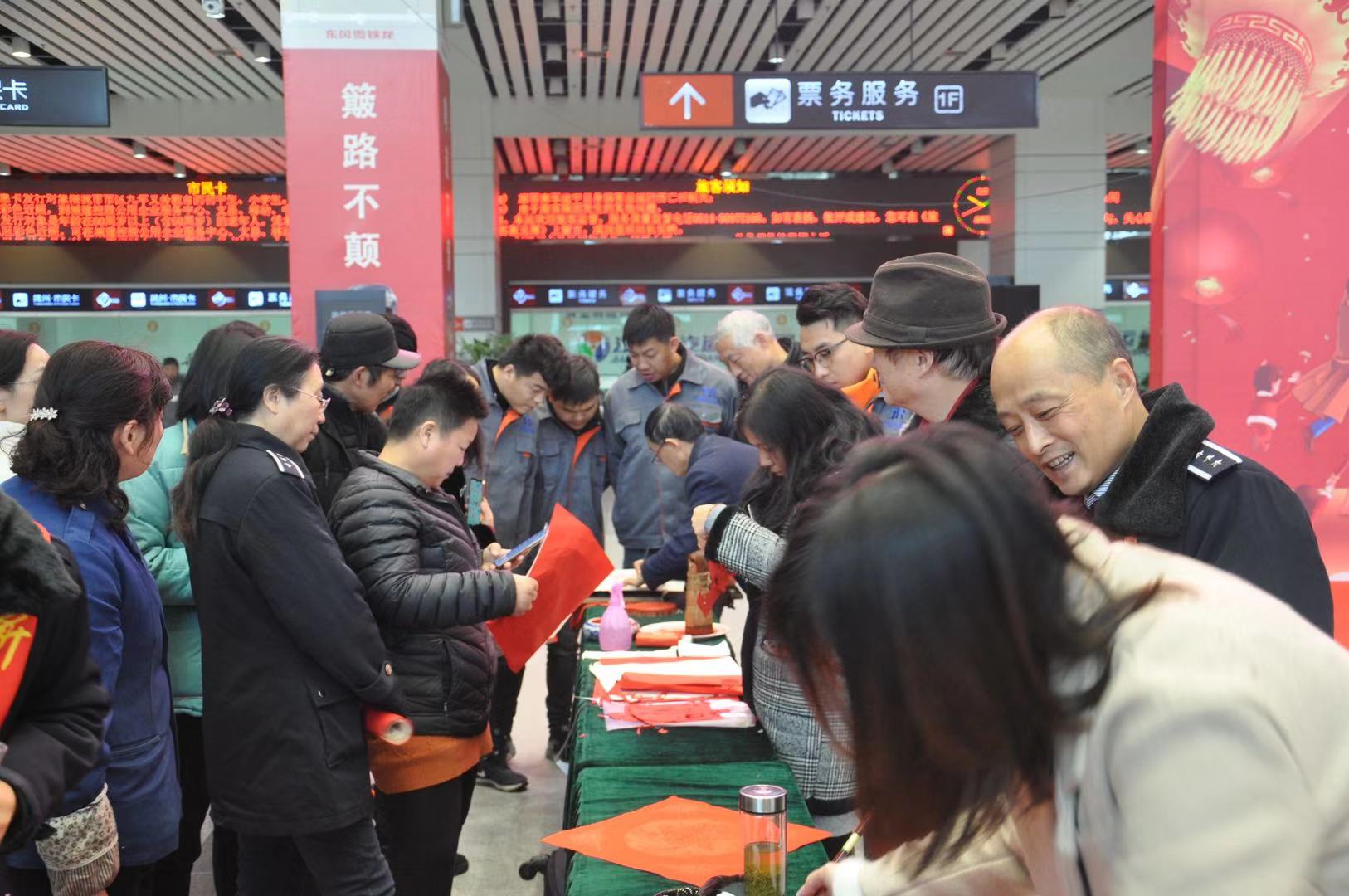 活動現(xiàn)場,揚(yáng)州市書法協(xié)會、剪紙協(xié)會、揚(yáng)州汽車站的志愿者和旅客們進(jìn)行了書法、剪紙創(chuàng)作送祝福的互動,在這寒冷的冬季,為歸鄉(xiāng)的旅客送去溫馨的祝福,讓旅客“溫暖相伴·幸;丶”。