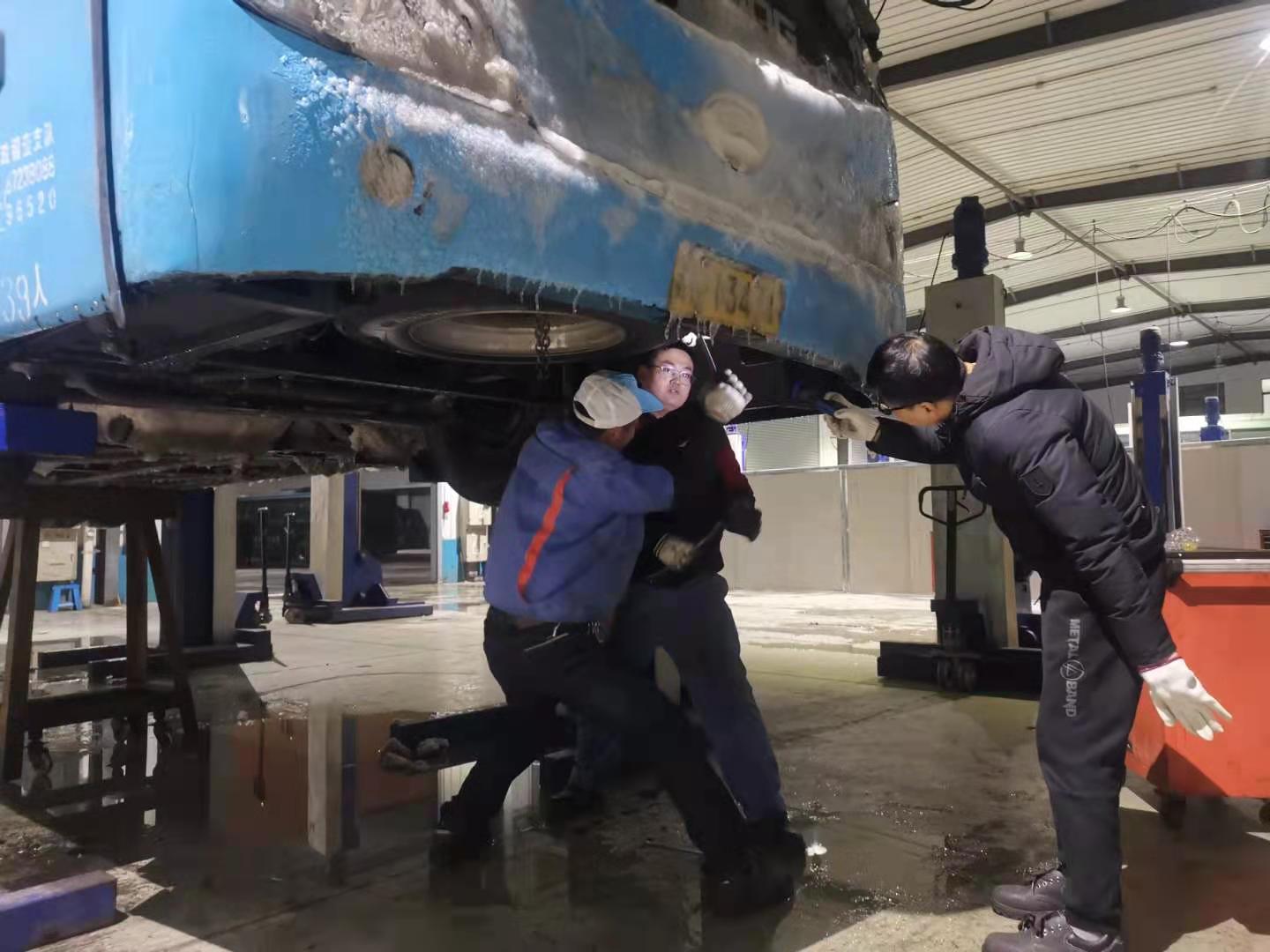 29日深夜修理廠對車輛進行搶修,揚汽出租的黨和職工清除場地冰凍積雪,及時消除安全隱患;在大家的努力下,教培中心科目二考場已無積雪積冰,車輛均已調試完好。