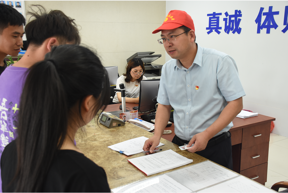 在報(bào)名大廳的服務(wù)現(xiàn)場(chǎng),龔宇峰為前來(lái)學(xué)駕的學(xué)員登記報(bào)名信息,辦理手續(xù),并與他們交談,耐心解答他們的問(wèn)題、囑咐在學(xué)習(xí)駕駛過(guò)程中需要注意的事項(xiàng)。