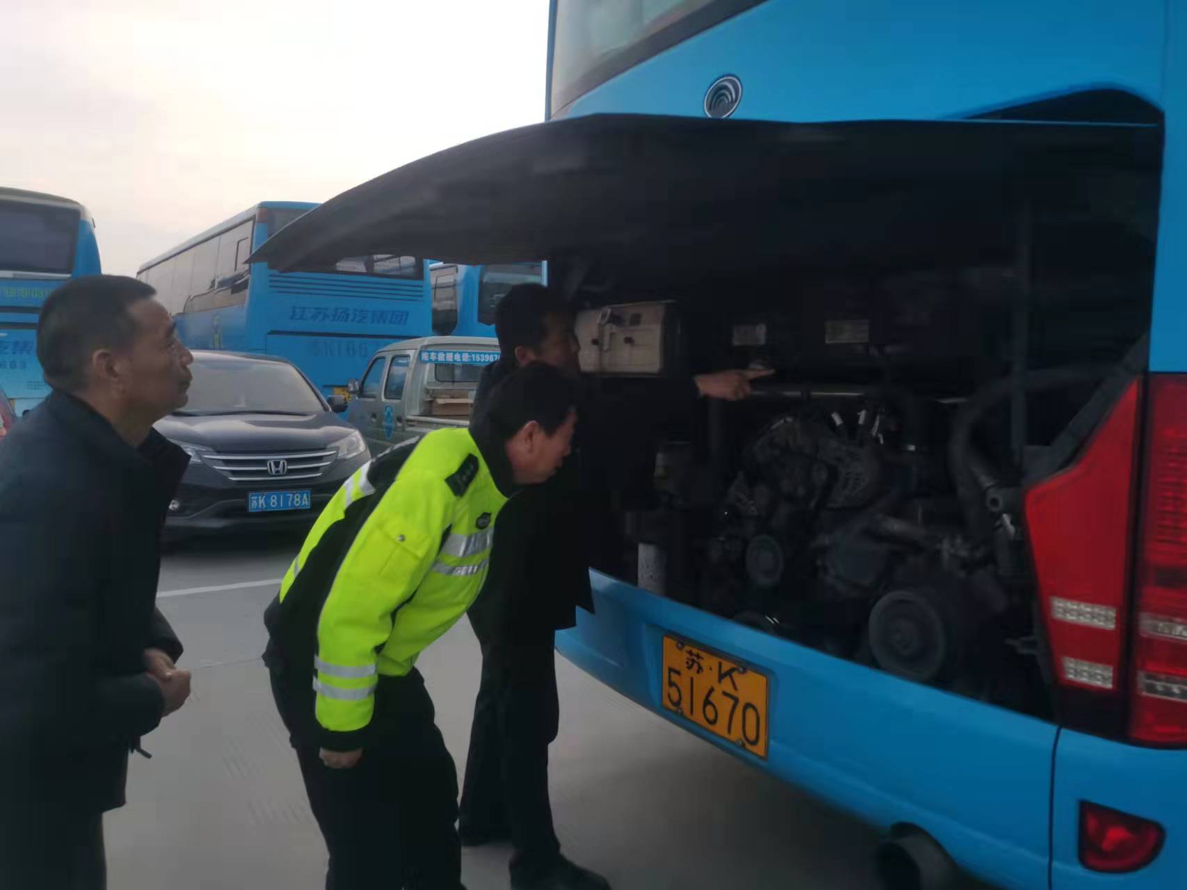 從1月13日起,集團(tuán)安全機(jī)務(wù)部結(jié)合公安交警部門相關(guān)工作要求,組織開展春運(yùn)車輛臨時(shí)檢驗(yàn)工作,確保車輛機(jī)務(wù)技術(shù)狀態(tài)完好,全力做好2022年春運(yùn)安全運(yùn)輸保障工作。揚(yáng)州市公安交警隊(duì)分管轄區(qū)鮑小勇、安全機(jī)務(wù)部相關(guān)負(fù)責(zé)人在現(xiàn)場指導(dǎo)春運(yùn)車輛臨檢工作。