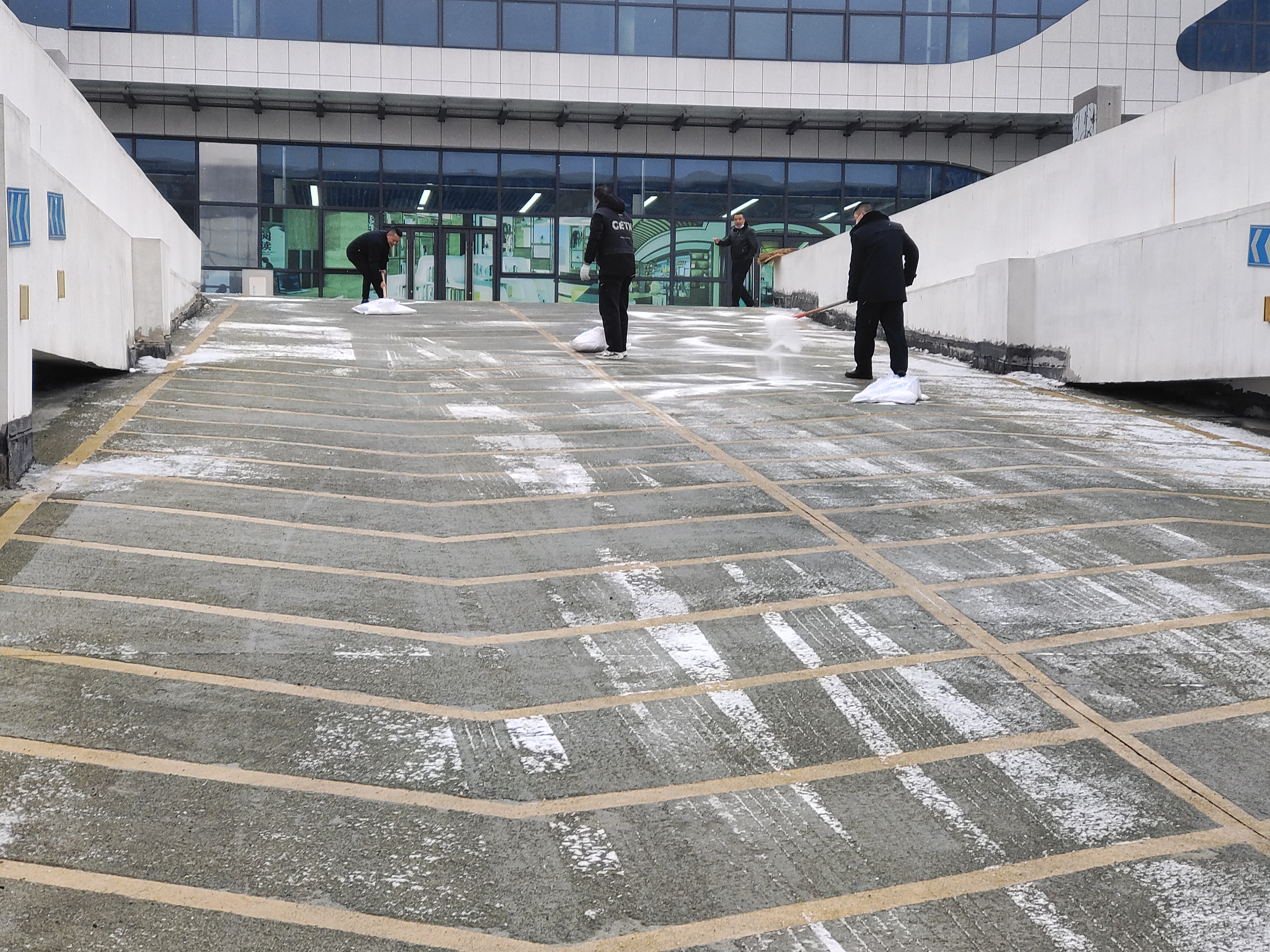 在揚(yáng)汽修理廠,為防止廠區(qū)地面冰凍,各部門、班組迅速對(duì)全廠范圍內(nèi)的積雪進(jìn)行清除,對(duì)廠區(qū)內(nèi)主干道、例保通道、倉(cāng)房陰面等區(qū)域噴撒融雪劑,為例保通道鋪上防滑草墊,確保廠區(qū)道路暢通。