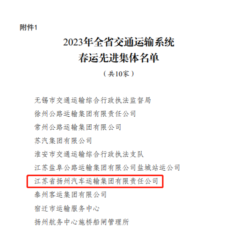 近日,省交通運輸廳下發(fā)的《關于表揚2023年全省交通運輸系統(tǒng)春運先進集體和個人的通報》,揚汽集團被授予“2023年全省交通運輸系統(tǒng)春運先進集體”榮譽稱號。
