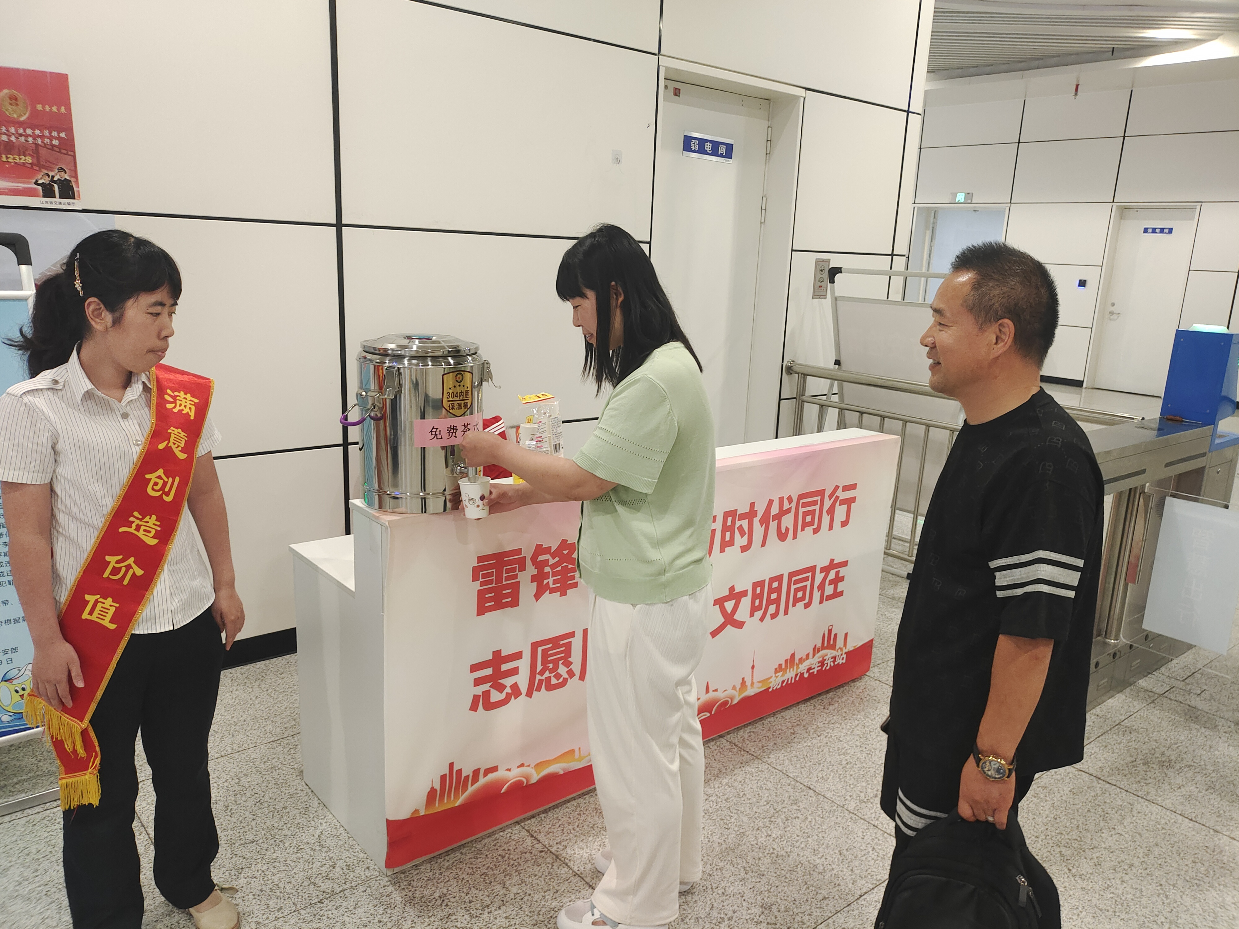 隨著夏季高溫的到來,為給旅客提供便民溫馨的服務(wù),營(yíng)造舒適旅途,車站工作人員分別在揚(yáng)州汽車站候車大廳、揚(yáng)州東站進(jìn)站口、江都汽車站服務(wù)臺(tái)設(shè)置茶水臺(tái),精心準(zhǔn)備了大麥茶、涼茶以及防暑降溫藥品等,黨員同志們更是發(fā)揮帶頭作用,通過雷鋒車將茶水服務(wù)實(shí)現(xiàn)了移動(dòng)化,為旅客們帶來身體上的清涼,讓他們感受到心靈上的溫暖。
