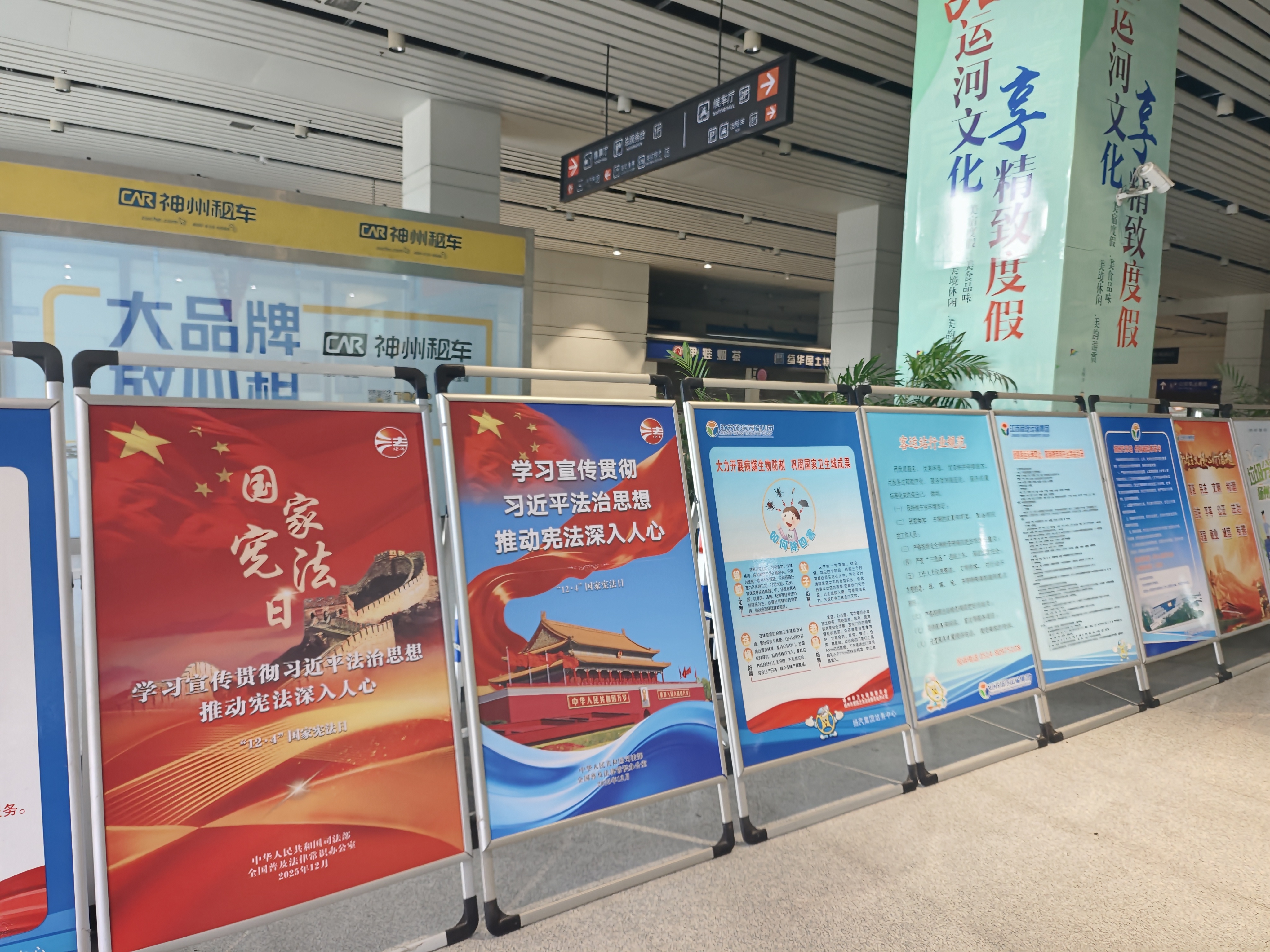 為營(yíng)造濃厚宣傳氛圍,集團(tuán)充分利用線上線下宣傳陣地。在線下,集團(tuán)充分利用交通服務(wù)窗口優(yōu)勢(shì),在東部樞紐、西部樞紐的候車區(qū),科目三考場(chǎng)候場(chǎng)區(qū)及集團(tuán)辦公區(qū)等場(chǎng)所,不僅通過電子大屏滾動(dòng)播放宣傳內(nèi)容,還精心布置了系列主題戧牌,使憲法知識(shí)融入日常工作與服務(wù)場(chǎng)景。線上宣傳同步推進(jìn),通過發(fā)放學(xué)習(xí)資料,擴(kuò)大了宣傳的覆蓋面和靈活性。