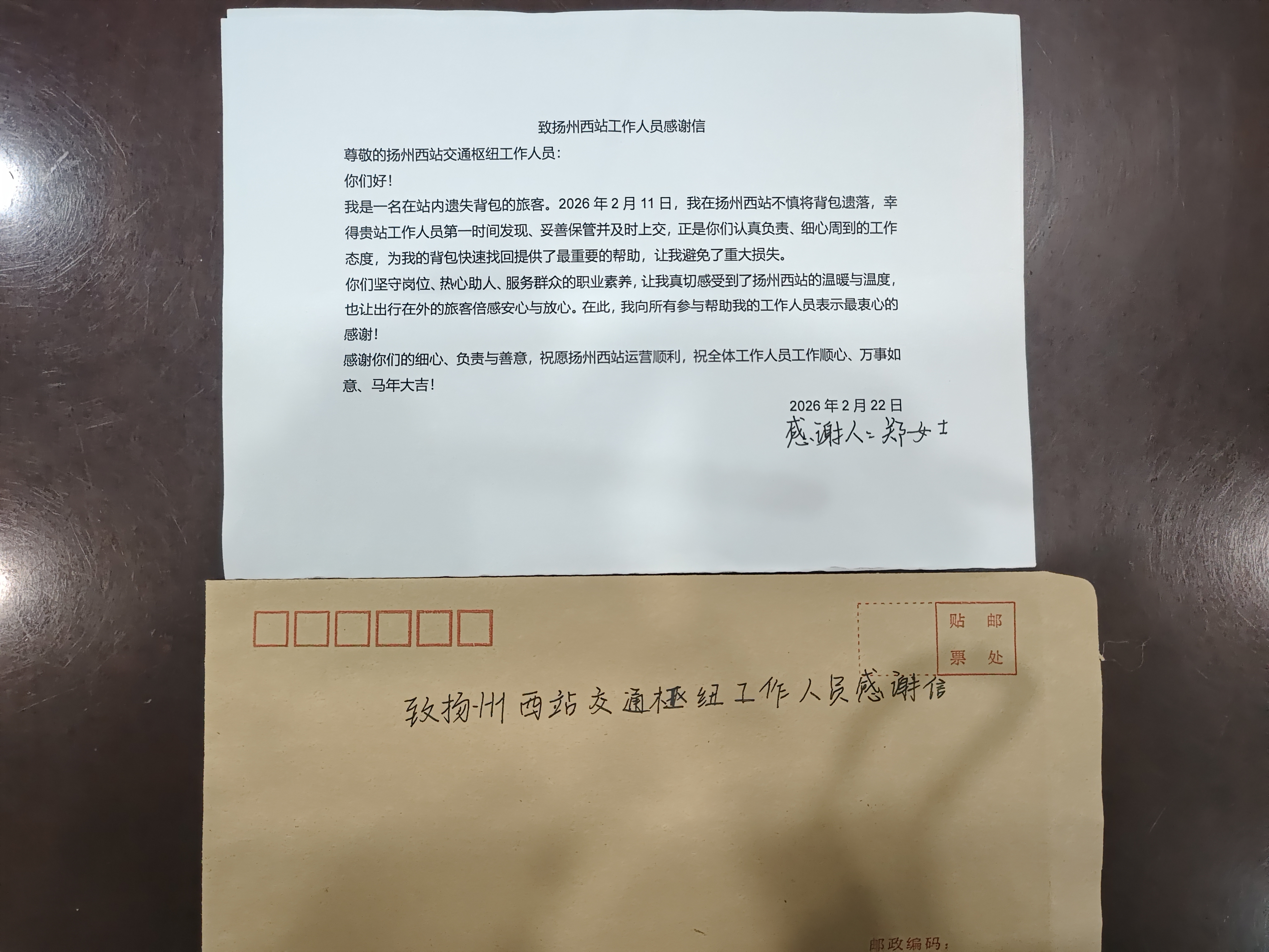 而這份“遲來(lái)”的感謝信,正是失主對(duì)揚(yáng)州站工作人員認(rèn)真負(fù)責(zé)態(tài)度的由衷肯定。信中寫(xiě)道:“從發(fā)現(xiàn)失物到妥善保管、再到主動(dòng)對(duì)接,每一個(gè)環(huán)節(jié)都體現(xiàn)出你們嚴(yán)謹(jǐn)細(xì)致、熱心助人的職業(yè)素養(yǎng)。正是因?yàn)橛心銈冞@樣堅(jiān)守崗位、默默付出的工作人員,才讓揚(yáng)州這座‘好地方’更溫暖、更安心。”